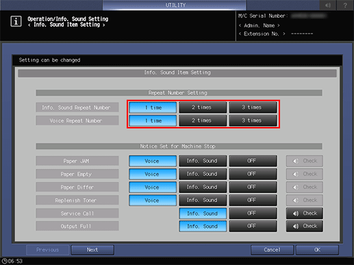 Specify the repeat count of Info. Sound or Voice that sounds when a job stops due to paper misfeed or paper out, and also specify whether or not to enable the sound individually for given items.