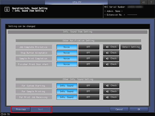 supplementary explanationThe Job Complete Pre-notice provided under Other Notification Setting allows you to specify whether or not to use the expected job completion time for information sound. Press Detail Setting, then select the desired time. Press OK to complete the setting and return to the previous screen.