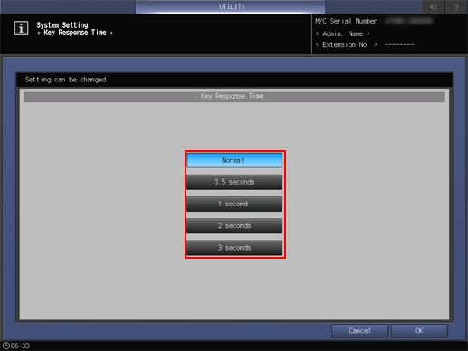 Select the time interval to get the response from the machine when a key or button is pressed on the touch panel or control panel.