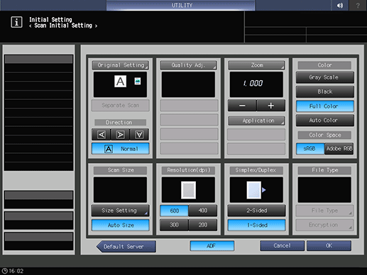 • For details about how to set the default values for File Type and Compress Method Color/Gray, refer to User Setting: Scan Setting.