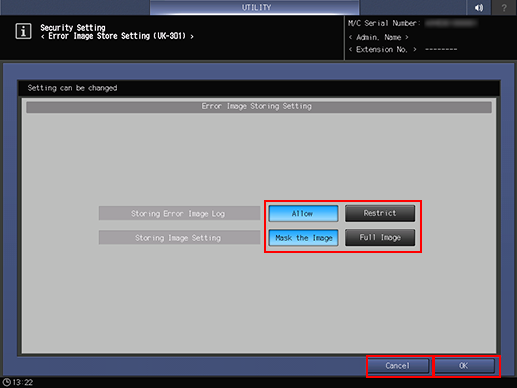 Storing Image Setting: Specify this option to mask an image to be stored as a log. If Mask the Image is selected, the image is stored with all areas within 1mm from the paper edge blackened. If Full Image is selected, the image is stored with no areas blackened. This item is only available when there is no problem even if the image comes someone's attention.
