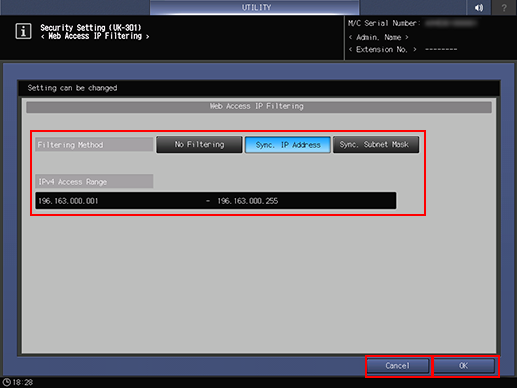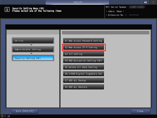 Press Security Setting (UK-301) on the Administrator Setting Menu screen, and then press Web Access IP Filtering.