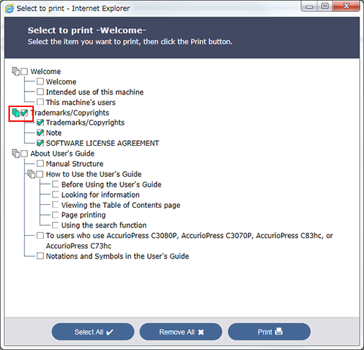 Clicking Select Print on the top right of the screen displays the pages selected with check boxes on the table of contents.