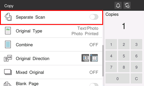 If the number of original sheets is so large that they cannot be loaded into the ADF at the same time, you can load them in several batches and handle them as one job. You can also scan the original using both ADF and Original Glass alternately.