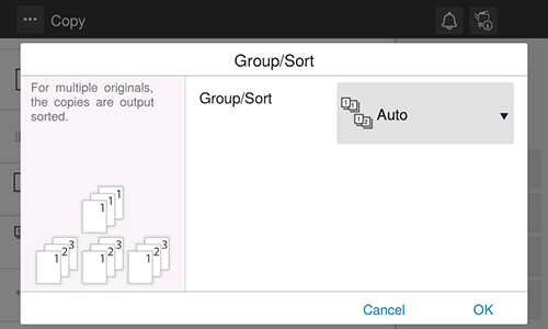 [Auto]: Automatically switches between Sort and Group according to the number of printed sheets for each set, and feeds out copies. If the number of printed sheets for each set is 1, the Group function is applied. If the number is 2 or larger, the Sort function is applied.