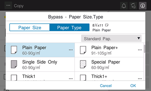 ) in [Plain Paper] of [Paper Type], and set to [Alter Thickness ON]. The paper tray set to [Alter Thickness ON] is placed to a low priority level among the paper trays in which plain paper is loaded. However, if [Alter Thickness ON] is set to all paper trays, the appropriate paper tray is selected based on the priority sequence specified in [Utility] - [Utility] - [System Settings] - [Auto Paper Tray Selection Settings].When loading custom-sized paper, directly enter the length and width of paper.