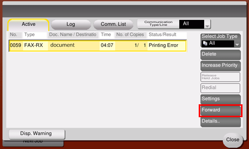 If it is not possible to promptly deal with the problem, the saved fax can be forwarded to another destination.