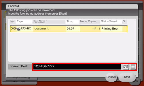 You can either directly enter a forwarding destination by tapping the input area or the keyboard icon, or select one from destinations registered in the machine by selecting the list icon.