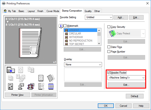 In the [Stamp/Composition] tab, select the [Header/Footer] check box. In addition, select the information you want to add to the header/footer.