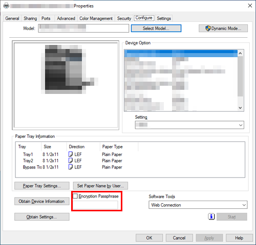 If OpenAPI communication is SSL-encrypted and the device information can be automatically obtained from the printer driver, the encrypted passphrase can be obtained from this machine. For details on how to encrypt OpenAPI communication with SSL, refer to