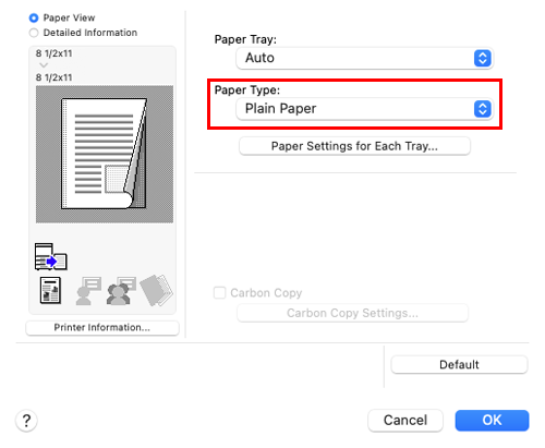 In [Paper Type] in [Paper Tray / Output Tray], select the type of paper for printing.