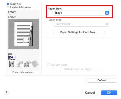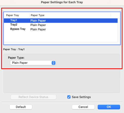When [Paper Settings for Each Tray] is enabled in the [Options] page of the printer driver, select [Paper Settings for Each Tray...] in [Paper Tray / Output Tray], and specify the paper type for each tray.