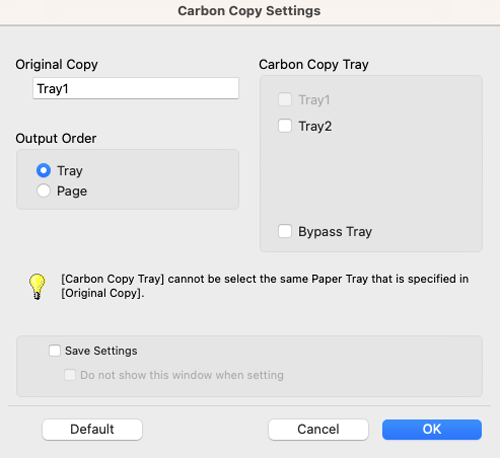 [Save Settings] | When the Save Setting check box is selected, the settings are saved. When the [Do not show this window when setting] check box is selected, this dialog box is not displayed when [Carbon Copy] is enabled. Using this function, you can save steps to configure settings the next time and after if you always specify the same carbon copy tray settings to execute a print job. |