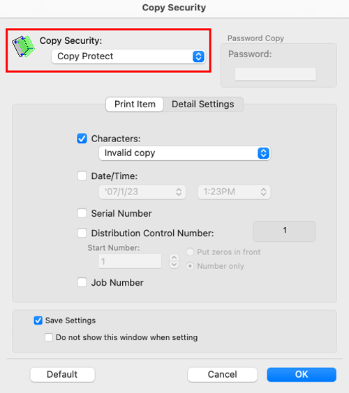 [Distribution Control Number] | Select this check box to print copy numbers when printing multiple sets of copies. If necessary, specify the format for the copy numbers and the page from which the copy number printing starts. |