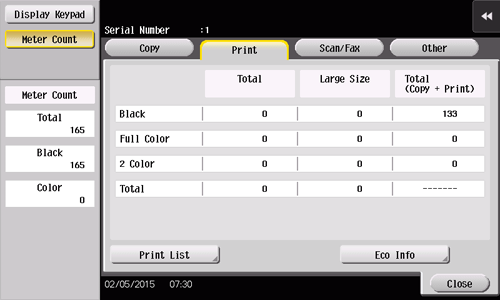 [Color] | Allows you to check the total number of pages printed in Single Color, 2 Color, or Full Color modes. |