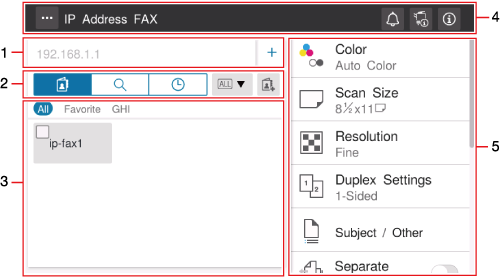 If you tap [IP Address FAX] on the home screen, the main screen of IP Address Fax is displayed.