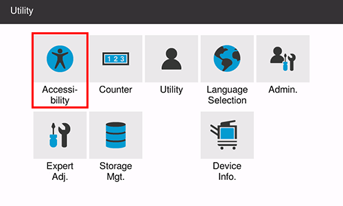 In [Accessibility] of [Utility], you can specify accessibility options of the operating environment such as the adjustment of the Touch Panel or a change of the keying sounds.