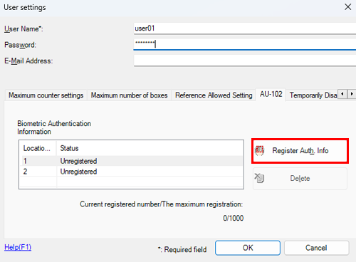 Up to two biometric authentication information items can be registered for each user. You should register different finger information in case you injure your finger.