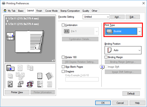 In [Print Type] in the [Layout] tab, select [Booklet].