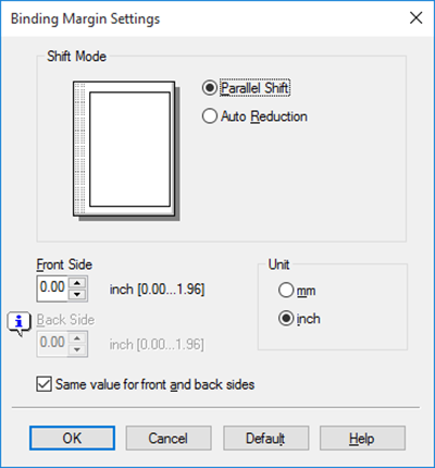 [Front Side]/[Back Side] | Specify the size of the margin on the front side. When you print on both sides, specify the size of the margin on the back side. When the [Same value for front and back sides] check box is selected, a margin of the same size is created on both front and back sides. |