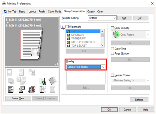 The overlay image is saved on your computer. From then on, when you select [Print Host Image] in [Overlay] in the [Stamp/Composition] tab, the saved overlay image is displayed in the list and is also available.