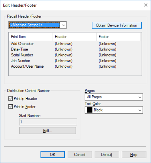 [Recall Header/Footer] | Select the header/footer to be recalled. If your computer can communicate with this machine, clicking [Obtain Device Information] obtains and displays the latest header/footer information registered in this machine. |