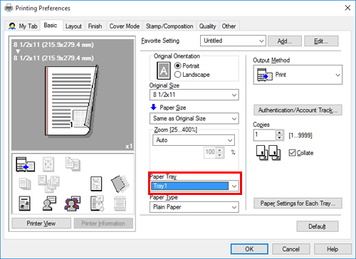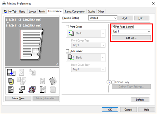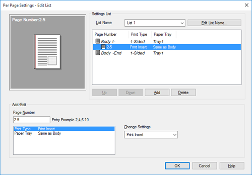 Create in advance a list that specifies the paper and print settings for each page. When printing on inserted paper, select the list you want to apply to printing.