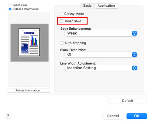 Selecting the [Toner Save] check box in [Quality] - [Application] adjusts the printing density in order to save the amount of toner consumed.