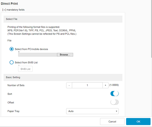 Direct Print is a function that enables you to directly send a file on your computer or in an SMB sharing folder to this machine and print it using Web Connection.