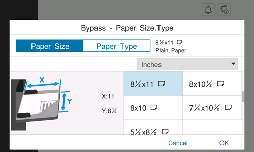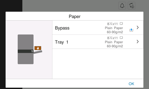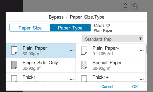 ) in [Plain Paper] of [Paper Type], and set to [Alter Thickness ON]. The paper tray set to [Alter Thickness ON] is placed to a low priority level among the paper trays in which plain paper is loaded. However, if [Alter Thickness ON] is set to all paper trays, the appropriate paper tray is selected based on the priority sequence specified in [Utility] - [Utility] - [System Settings] - [Auto Paper Tray Selection Settings].When loading custom-sized paper, directly enter the length and width of paper.