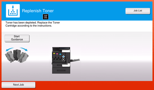 When it is time to replace a Toner Cartridge, a replacement prompt message appears. Replace it based on the maintenance contract. You can tap [Start Guidance] to display the replacement procedure on the screen and check it.