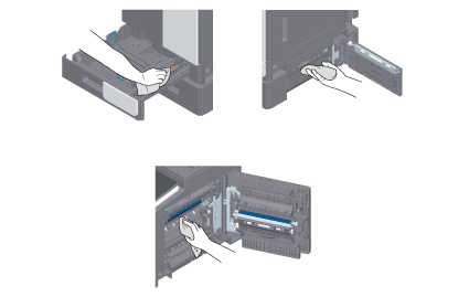 - The inside of this product has areas subject to high temperature, which may cause burns. When checking the inside of the unit for malfunctions such as a paper misfeed, do not touch the locations (around the fusing unit, etc.) which are indicated by a "Caution HOT" caution label. A burn could result.