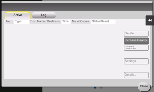 Tap [In Progress] to display active or standby jobs on this machine. As necessary, you can reorder print jobs or delete a standby job.