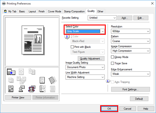 Select [Gray Scale] from [Select Color] in the [Quality] tab, then click [OK].