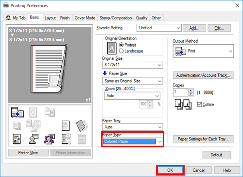 A. Yes. You can easily customize the window from the properties window of the printer driver by registering frequently used functions en masse on My Tab or registering settings for respective tabs as your favorite for quick activation.