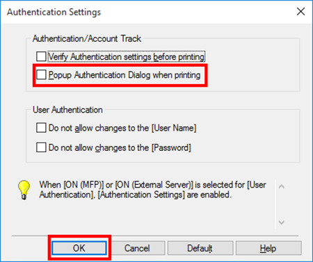 In [Authentication/Account Track], select the [Popup Authentication Dialog when printing] check box, then click [OK].