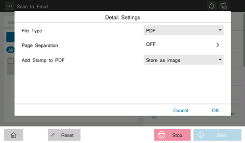 [Add Stamp to PDF] | Select whether to combine a PDF as an image or text when printing the date/time, page number, and header/footer on the PDF. |