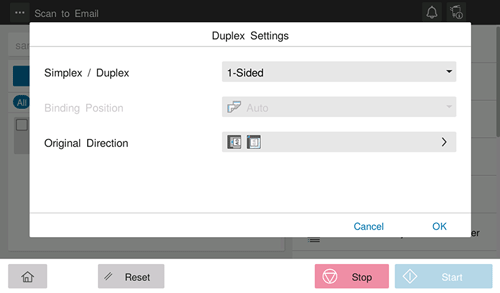 [Simplex/Duplex] | Select the side to scan the original (Simplex/Duplex). |