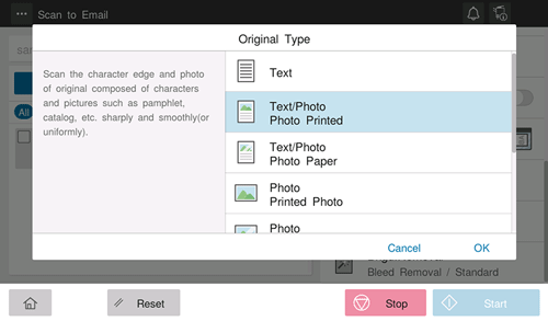 [Text/Photo - Printed Photo] | Scans an original consisting primarily of text and photos at the optimum image quality level. This function sharpens the edges of each character and reproduces smoother photos. Select this option to scan printed originals such as brochures and catalogs. |