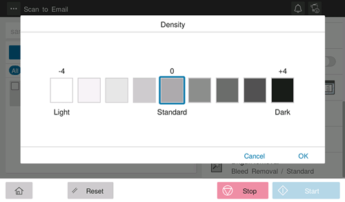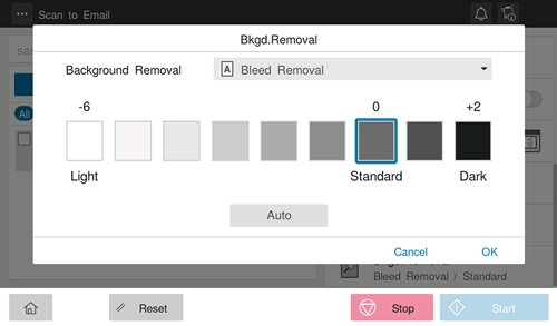 [Bleed Removal] | Adjust the density of the background color to prevent bleeding of the back of the paper when printing a 2-sided original that is so thin that the contents of the back side would be scanned. Selecting [Auto] automatically determines the density of the background color, and scans an original at the optimum background density level. |