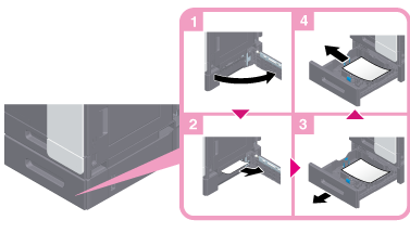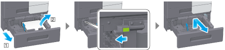 Release the lock as shown in the figure, pull out the paper tray, then remove any unnecessary pieces of paper.