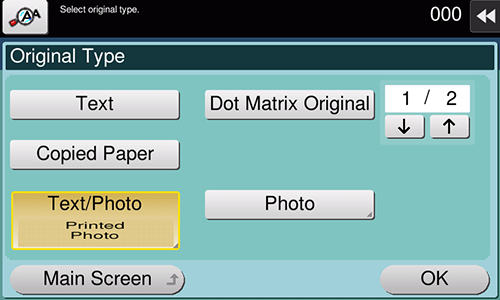 [Copied Paper] | Scans an original, which is output with an even density from the copier or printer, at the optimum level of image quality. |