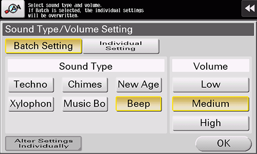 [Sound Type/Volume Setting] | Specify the sound type and volume for each of [Operation Confirmation Sound], [Successful Completion Sound], [Completed Preparation Sound], [Caution Sound], [Deletion Sound], and [Authentication Sound]. When [Batch Setting] is selected, all the sound type and volume will be set at once. When [Individual Setting] is selected, all the sound type and volume will be set separately. |