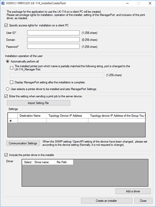 When not including the printer driver in LK-114_InstallTool, clear the [Include the printer driver in the installer] check box. Go to Step 8.