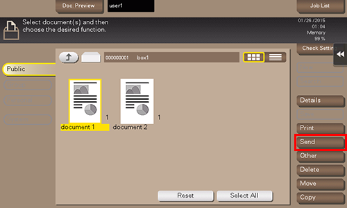 This example uses the Public User Box for explanatory purposes. To use a Personal User Box or a Group User Box, tap [Personal] or [Group], and select the desired User Box.