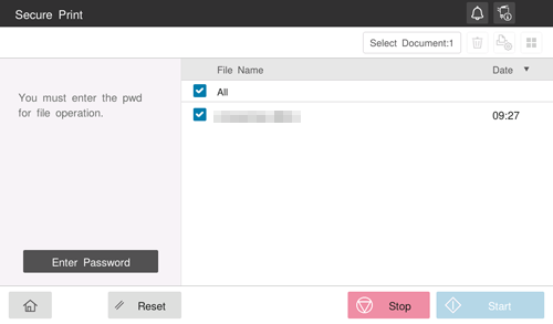 ) in the upper right to set print options.If [Prohibit Functions] is set to [Mode2] in [Utility] - [Administrator] - [Security] - [Security Details] - [Prohibit Functions], you need to also enter the password when selecting a file from the Secure Print User Box. You need to enter the password for each file even if secure documents have the same document ID. Therefore, the security level is higher than that of default [Mode1].