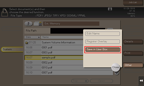 You can also perform the same operation by tapping [System] - [External Memory] in User Box mode.