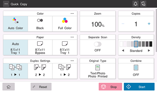 If you tap [Quick Copy] on the home screen, the main screen of quick copy mode is displayed.