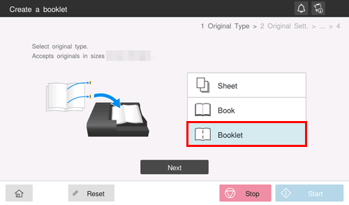 Copy the unstapled book original ([Booklet]) to create a booklet.