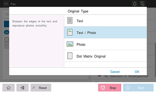 [Dot Matrix Original] | Scans an original, which consists primarily of text such as thin or faint characters, at the optimum image quality level. This function reproduces text using high pixel density, creating easy-to-read text. |